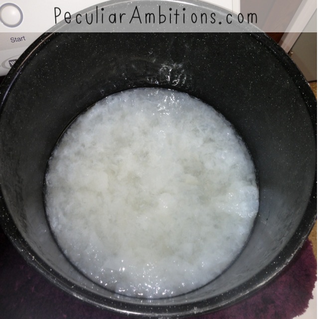 2. Add 1 gallon hot water to the pot and add the grated (or liquid) soap. Heat until soap has dissolved.