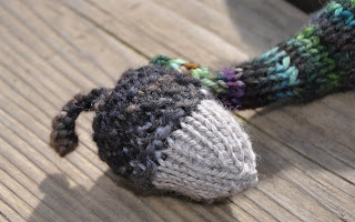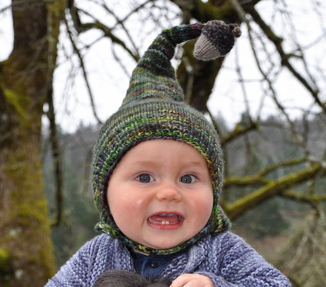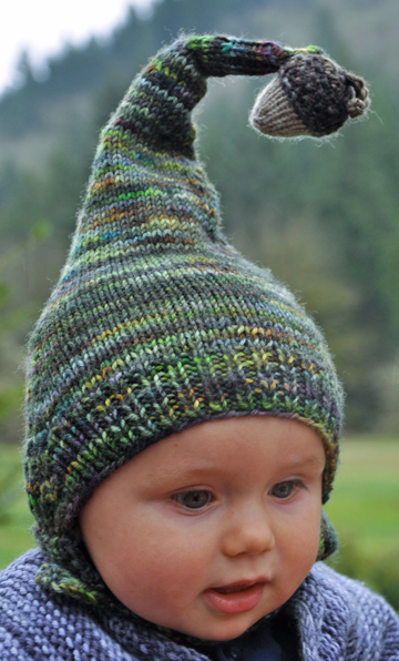 The peak is exaggerated, stuffed with wool roving and topped off with a knit acorn!